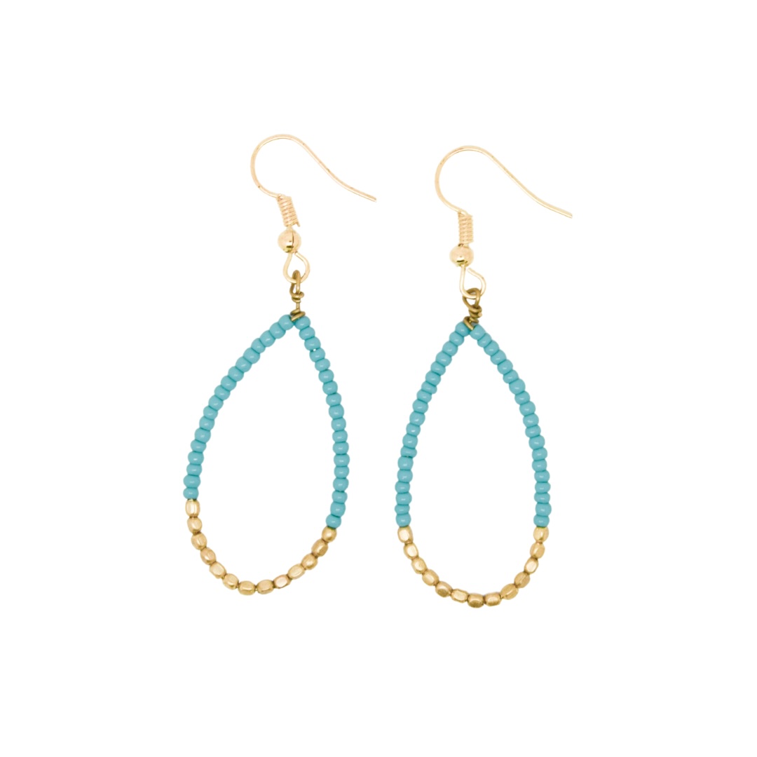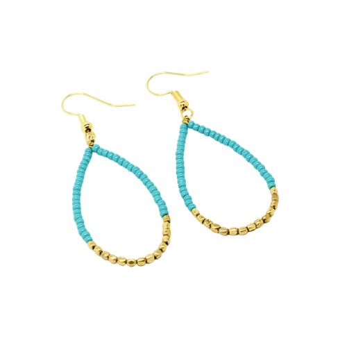 Created using turquoise and brass seed beads strung on brass wire and carefully shaped into a teardrop.